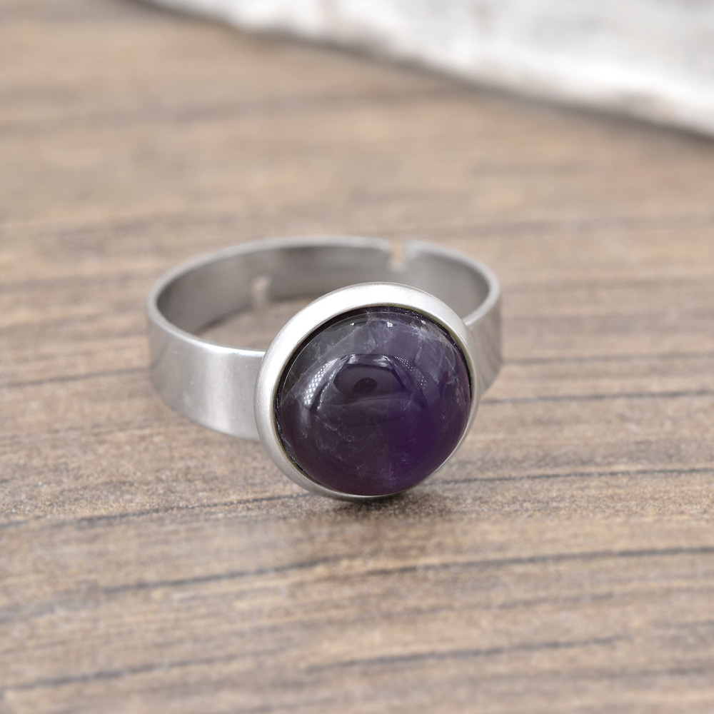 Bague réglable en Acier inoxydable ornée d'une Pierre Naturelle Amethyste 10mm. Facile à ajuster, elle s'adaptera à la taille de votre doigt (Taille 50 à 60).